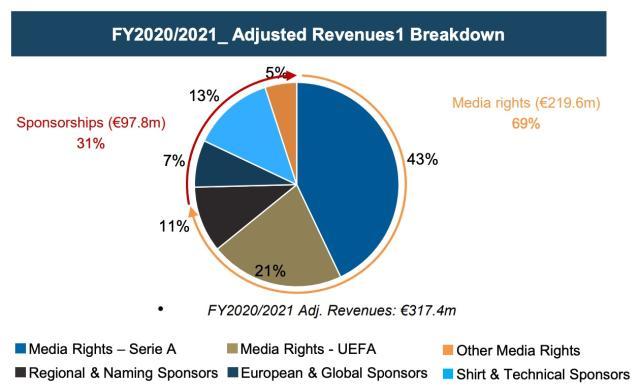 另一方面,上赛季意甲因新冠空场进行,让本来场均上座率和门票收入都位居意甲桂冠的国米遭受惨重损失。国米官方在财报中表示,新冠为球队直接带来的经济损失在1.1亿左右,其中4000万来自赞助权益受限导致的赞助损失,7000万则来自比赛日的收入流失——按照此前年度国米的财报数据,门票收入归零带来的损失应当在4500万左右,其余的与周边销售等进项相关。